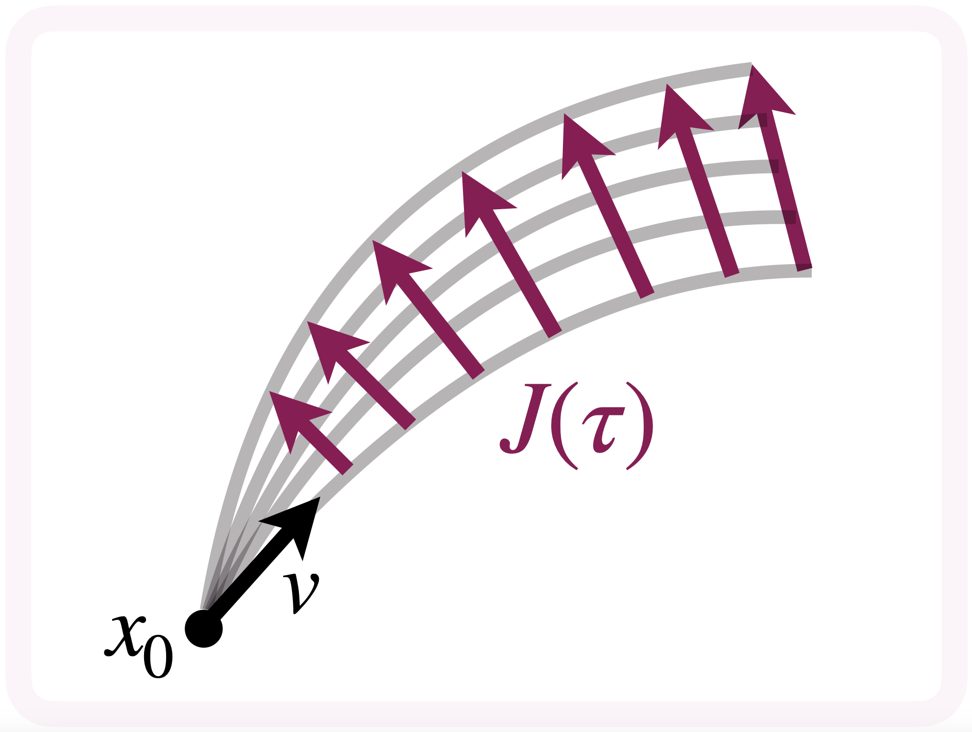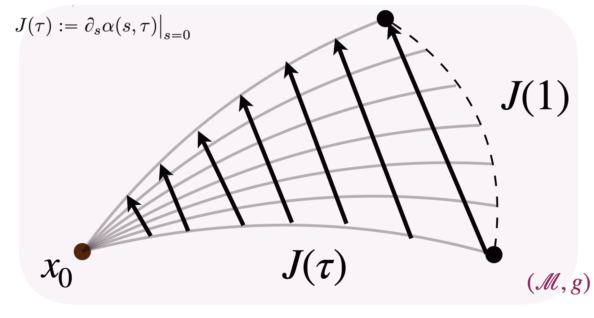 \[\alpha(s, \tau) := \gamma_s \colon \tau \mapsto \exp_{x_0}\!\bigl(\tau\,(v + sw)\bigr)\]with $s \in [0,1]$ and $\tau \in [0,1]$. The Jacobi field is defined at each timestep $\tau \in [0,1]$ as the vector field obtained by differentiating with respect to the parameter $s$ and evaluated at $s=0$. Intuitively, this corresponds to measuring the perturbation of geodesics in the family with respect to the “reference geodesic” at $s = 0$.