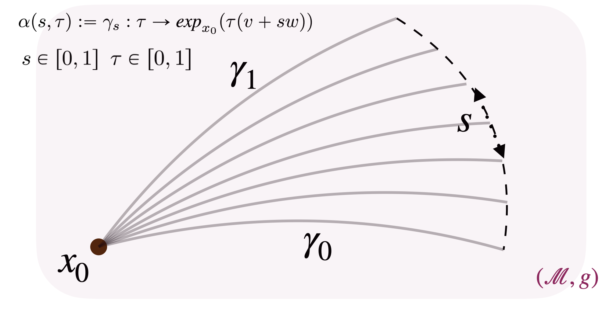 \[\dot{\gamma}_s(0) = v^s := v + s\, w, \quad v, w \in T_{x_0}\mathcal{M}\]where $sw$ represents the perturbation level. This family of geodesics can be parametrized as: